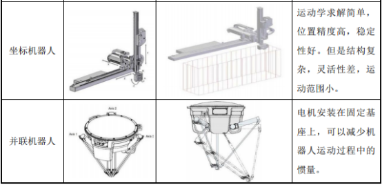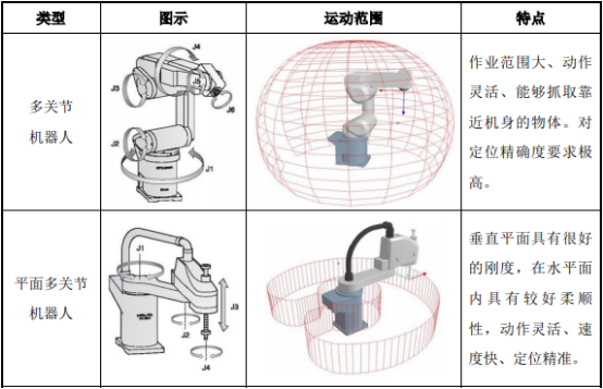 ①根据机械结构分类:根据工业机器人的机械结构,工业机器人一般可分为多关节机器人、平面多关节机器人、坐标机器人、并联机器人等。各类型机器人具体情况如下: