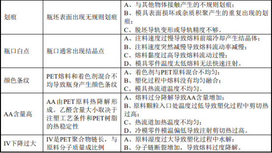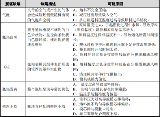 塑料瓶外观光洁、透明、各段壁厚适宜、瓶口直立、中心点居中、脚部壁厚均匀,系检验瓶坯质量的常用指标。瓶坯智能成型系统需要不断技术升级,避免瓶坯制品出现下列常见的缺陷:
