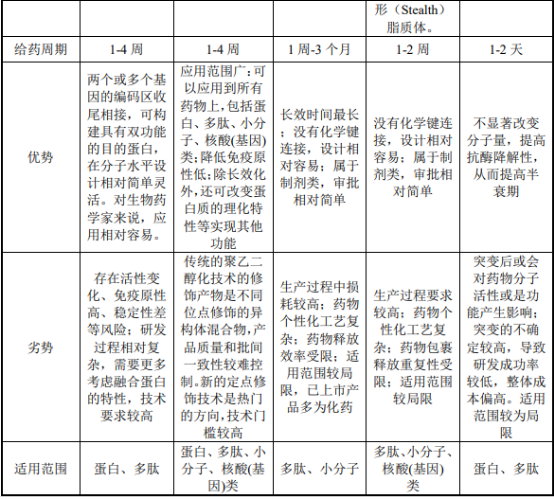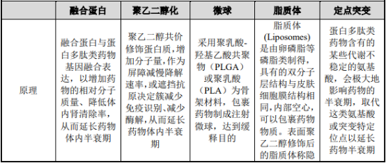 目前,蛋白质及多肽药物的长效化手段包括聚乙二醇修饰、融合蛋白、微球、脂质体、定点突变等多种手段,具体对比情况如下: