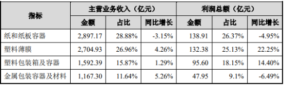 据中国包装联合会发布的《中国包装行业年运行报告(2019年)》,塑料已成为包装材料中创收、获利最高的一种品类,塑料包装包括塑料薄膜和塑料包装箱及容器,其中塑料包装箱及容器表现出较好的增长态势,2019年主营业务收入增长1.29%、利润总额增长14.40%。2019年,四个子类行业的主营业务收入、利润总额及占整个包装行业的比例情况如下: