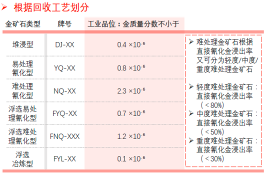 黄金矿石分类众多,根据中国黄金矿石特点,金矿石可以分类为贫硫化物金矿石、多硫化物金矿石、含金多金属矿石、含碲化金金矿石、含金铜矿石等五种主要类型;根据回收工艺不同,又可以分为堆浸型、易处理氰化型、难处理氰化型、浮选易处理氰化型、浮选难处理氰化型、浮选冶炼型等类型的矿石。