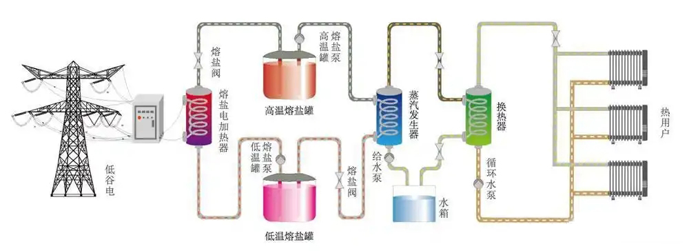 熔盐是指熔融态下的液体盐,工程中使用的熔盐通常指无机盐熔融体。熔盐具有高沸点、低粘度、低蒸汽压力和高体积热的特点,是一种优良的传热储热介质。熔盐储能技术即利用熔融态的无机盐(通常为硝酸盐、碳酸盐或氯化物等混合物)作为储热介质,通过其显热变化来实现能量存储与释放的一种新型储热技术。在电力系统中,它通常被视为一种新型储能形式,能够将电能、太阳能光热等能源转化为高温热能存储,并可根据需求稳定地释放热能用于发电、工业供热或供蒸汽等服务。