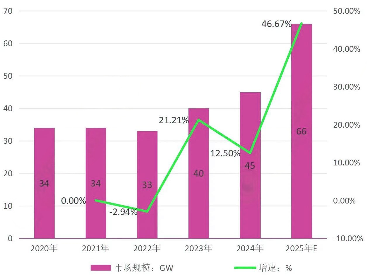 根据中金企信最新市场调研数据显示,全球熔盐储能行业市场规模从2020年的34GW增长至2024年的45GW。预测2025年,全球市场规模将达66GW,展现出良好的增长态势。在技术路线上,双罐间接熔盐储热系统因其技术成熟度和高可靠性,依然是当前绝大多数大型商业化项目的首选方案,构成了行业的技术基座。